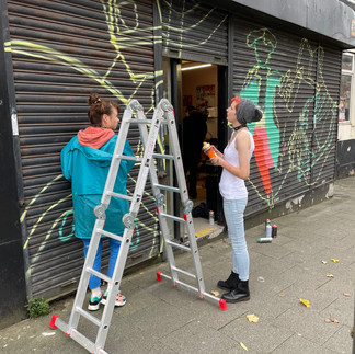Vibe members led by visiting artist Alex Godwin alongside Vibe's Jenny Anderton have brightened up our frontage on Drake Street with a vibrant, colourful mural on what were very drab shutters.